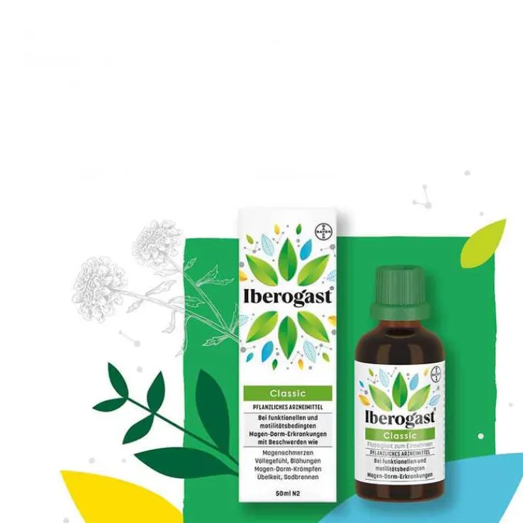 Iberogast® Classic. Zur Behandlung von funktionellen und motilitätsbedingten Magen-Darm-Erkrankungen wie Reizmagen- und Reizdarmsyndrom sowie zur unterstützenden Behandlung der Beschwerden bei Magenschleimhautentzündung (Gastritis). Diese Erkrankungen äußern sich vorwiegend in Beschwerden wie Magenschmerzen, Völlegefühl, Blähungen, Magen-Darm-Krämpfen, Übelkeit und Sodbrennen. Das Arzneimittel enthält 240 mg Alkohol (Ethanol) pro 20 Tropfen. Stand: 09/2023. Bayer Vital GmbH, Kaiser-Wilhelm-Allee 70, 51373 Leverkusen, Deutschland.