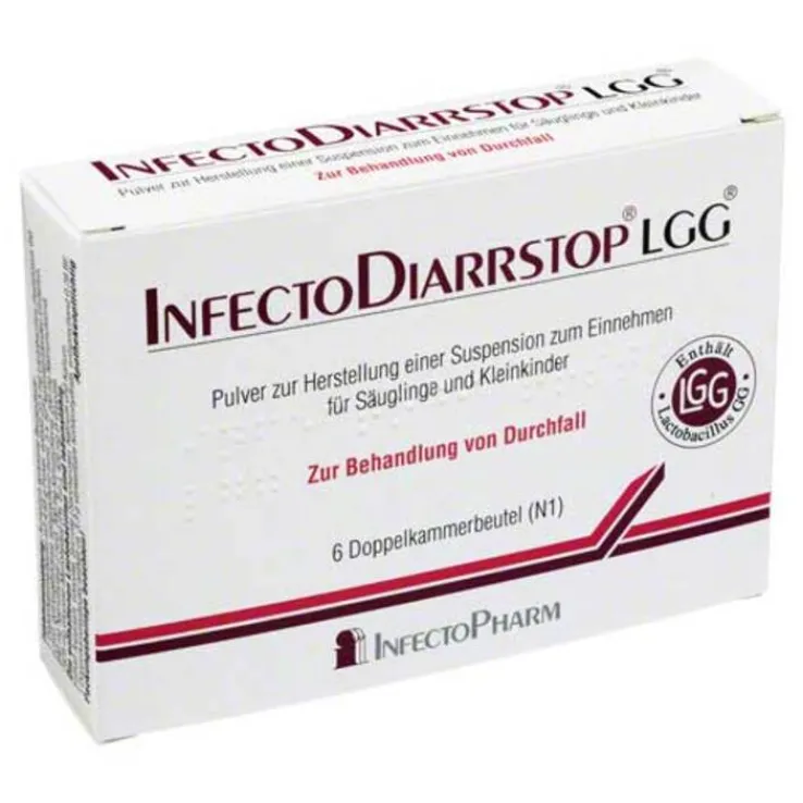 InfectoDiarrstop LGG. InfectoDiarrstop LGG werden zur Behandlung von Durchfall (Diarrhö) bei Säuglingen und Kleinkindern eingesetzt. Enthält Aspartam (9 mg pro Doppelkammerbeutel). Aspartam ist eine Quelle für Phenylalanin. Es kann schädlich sein, wenn Ihr Kind eine Phenylketonurie (PKU) hat, eine seltene angeborene Erkrankung, bei der sich Phenylalanin anreichert, weil der Körper es nicht ausreichend abbauen kann. Ein Doppelkammerbeutel enthält 4,02 mmol (oder 157,2 mg) Kalium. Wenn Ihr Kind an eingeschränkter Nierenfunktion leidet oder eine kontrollierte Kalium-Diät (Diät mit niedrigem Kaliumgehalt) einhalten muss, sollten Sie dies berücksichtigen. Enthält 276 mg Natrium (Hauptbestandteil von Kochsalz/Speisesalz) pro Doppelkammerbeutel. Dies entspricht 14 % der für einen Erwachsenen empfohlenen maximalen täglichen Natriumaufnahme mit der Nahrung. Dieses Arzneimittel enthält bestimmte Zucker (Glucose und Sucrose). Bitte geben Sie Ihrem Kind dieses Arzneimittel erst nach Rücksprache mit Ihrem Arzt, wenn Ihnen bekannt ist, dass Ihr Kind unter einer Unverträglichkeit gegenüber bestimmten Zuckern leidet. 1 Doppelkammerbeutel enthält: InfectoDiarrstop LGG ca. 3,1 g verwertbare Kohlenhydrate. Zu Risiken und Nebenwirkungen lesen Sie die Packungsbeilage und fragen Sie Ihre Ärztin, Ihren Arzt oder in Ihrer Apotheke. Stand: 11/2023