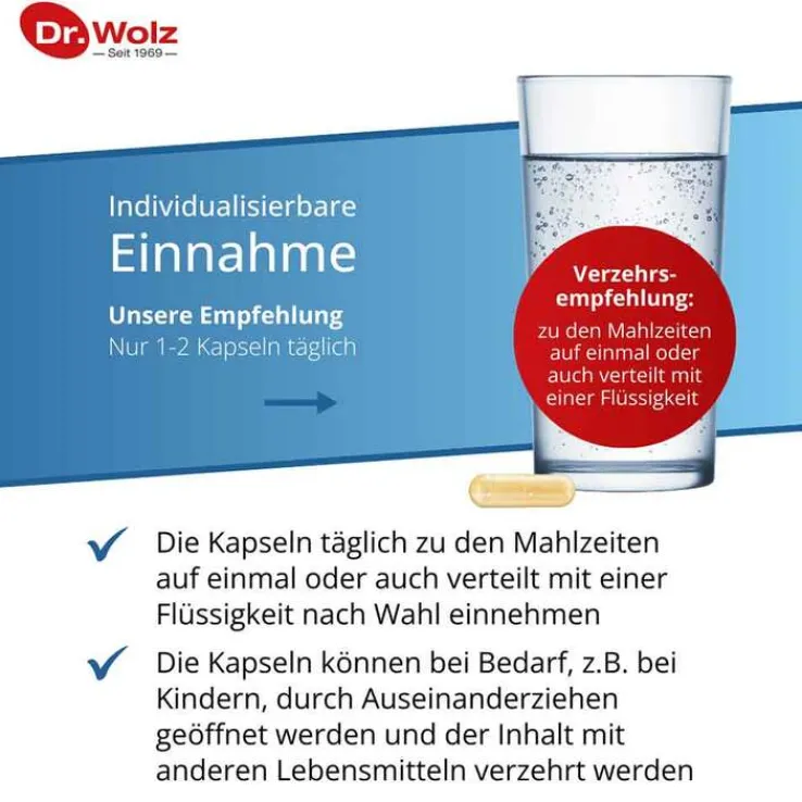 1-2 Kapseln täglich zu den Mahlzeiten mit einer Flüssigkeit Ihrer Wahl.