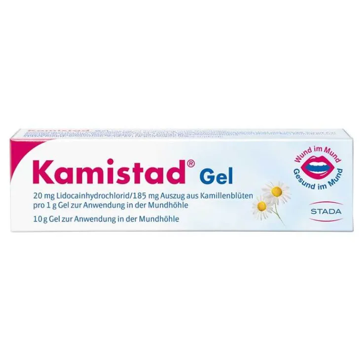 Kamistad® Gel 20 mg Lidocainhydrochlorid/185 mg Auszug aus Kamillenblüten pro 1 g Gel zur Anwendung in der Mundhöhle. Wirkstoffe: Lidocainhydrochlorid und Auszug aus Kamillenblüten. Zur Behandlung von leichten Entzündungen des Zahnfleisches und der Mundschleimhaut. Bei fehlender Besserung der Entzündungszeichen innerhalb 1 Woche sowie beim Auftreten unklarer Beschwerden sollte ein Arzt aufgesucht werden. Enthält Benzalkoniumchlorid und Zimt (Zimtaldehyd). Zu Risiken und Nebenwirkungen lesen Sie die Packungsbeilage und fragen Sie Ihre Ärztin, Ihren Arzt oder in Ihrer Apotheke. STADA Consumer Health Deutschland GmbH, Stadastraße 2–18, 61118 Bad Vilbel. Stand: August 2020