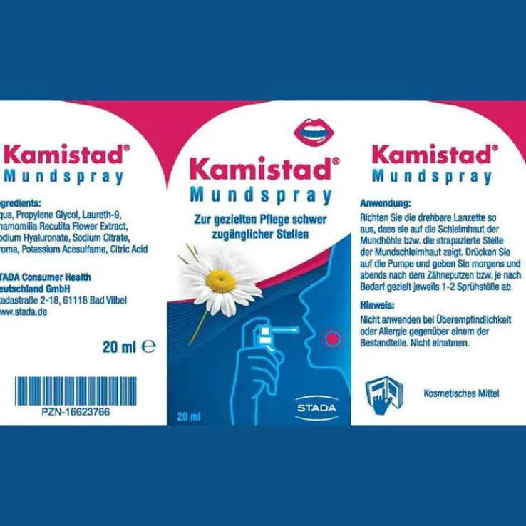 Kamistad® Mundspray eignet sich zur therapiebegleitenden Pflege bei zu Aphten, Rhagaden und leichten Entzündungen neigender Mundschleimhaut. Kamistad® Mundspray ist zuckerfrei und ohne Alkoholzusatz.