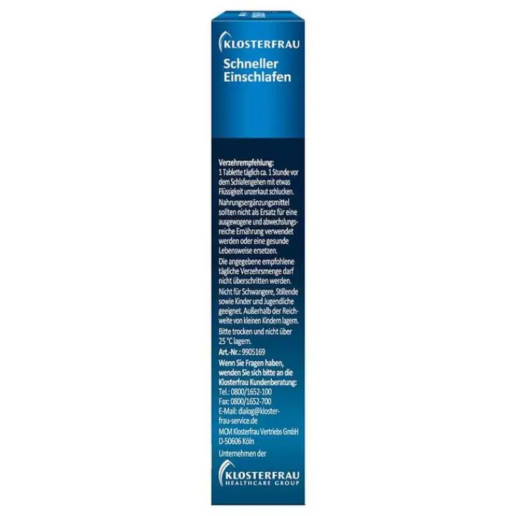 Klosterfrau schneller Einschlafen mit 2,0 mg Melatonin verkürzt die Einschlafzeit.* Melatonin ist ein körpereigener Botenstoff, der den natürlichen Schlaf fördert und den Schlaf-Wach-Rhythmus stabilisiert. Klosterfrau schneller Einschlafen enthält zusätzlich Schlafbeeren-Blätter und -Wurzel Extrakt.