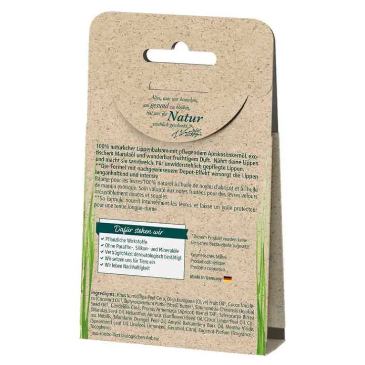 100% natürlicher Lippenbalsam mit pflegendem Aprikosenkernöl, exotischem Marulaöl und wunderbar fruchtigem Duft. Nährt die Lippen und macht sie samtweich. Für unwiderstehlich gepflegte Lippen. Die Formel mit nachgewiesenem Depot-Effekt versorgt die Lippen langanhaltend und intensiv.