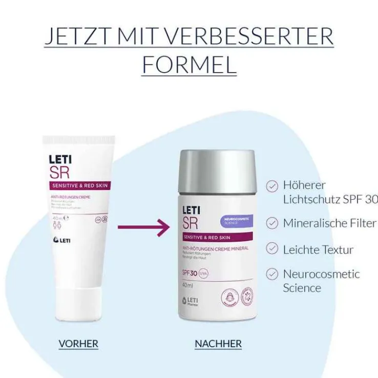 Zudem tragen Pflegewirkstoffe zur Hautberuhigung zu einem verbessertem Hautzustand bei. LETI SR wurde speziell für empfindliche und gerötete Haut sowie Rosazea Subtyp I entwickelt.