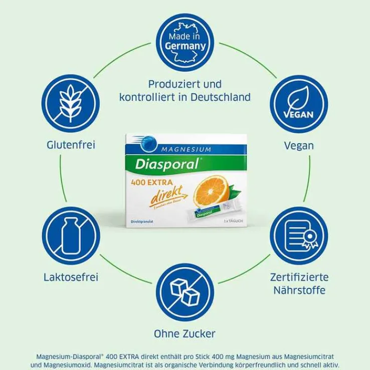 Magnesium Diasporal 400 Extra Direkt Granulat – Das Direktgranulat der Diasporal extra-Klasse. Extra stark. Extra fruchtig. Extra schnell.