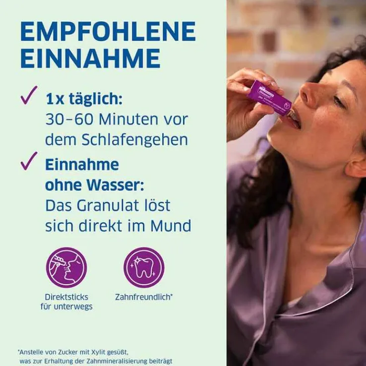 1 x täglich den Inhalt eines Sticks ca. 30-60 min vor dem Schlafengehen einnehmen.
