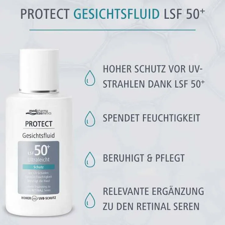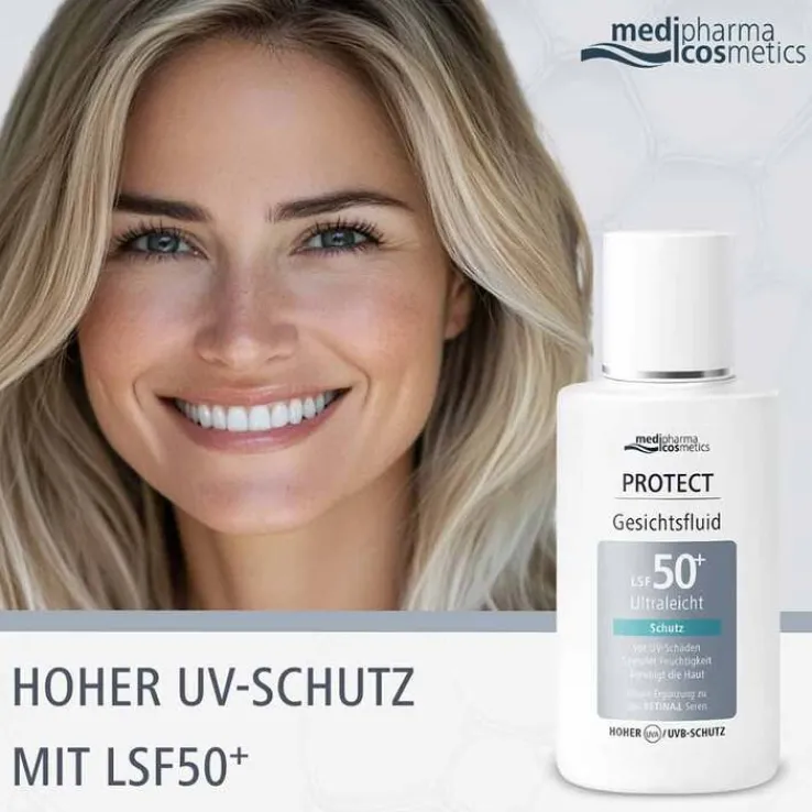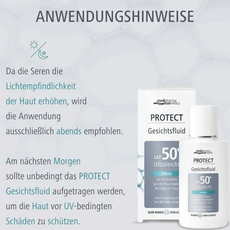 Das Protect Gesichtsfluid LSF 50+ von medipharma cosmetics schützt die Haut zuverlässig vor UV-Schäden und ist die ideale Ergänzung zu den medipharma Retinal Seren. Das Gesichtsfluid mit sehr hohem Lichtschutzfaktor spielt eine wichtige Rolle beim Schutz der Haut am nächsten Morgen.
