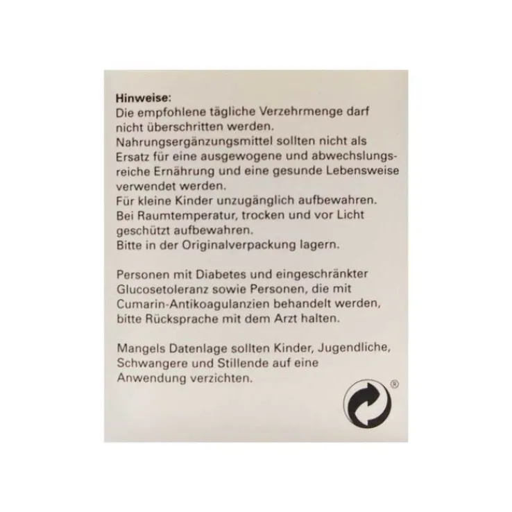 Personen mit Diabetes und eingeschränkter Glucosetoleranz sowie Personen, die mit Cumarin-Antikoagulantien behandelt werden bitte Rücksprache mit dem Arzt halten.