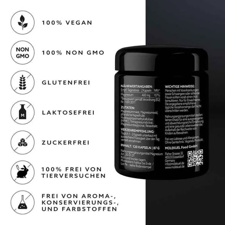 Dieser Magnesiumkomplex enthält kein Magnesiumstearat und ist frei von Aroma-, Konservierungs- und Farbstoffen. Darüber hinaus ist dieses Produkt glutenfrei, laktosefrei, gelatinefrei und zuckerfrei.