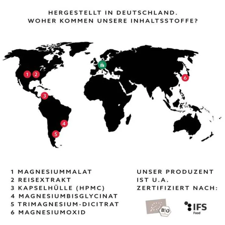 Das Magnesiumkomplex wurde in Deutschland zusammen mit Experten nach höchsten Standards entwickelt. Die sorgsam zusammengestellte Kombination mit vier verschiedenen Magnesiumverbindungen liefert Ihnen 400 mg elementares Magnesium pro Tagesdosis (pro 2 Kapseln). Mit jedem Produkt erhalten Sie je nach Verzehrmenge einen 2 bis 4-Monatsvorrat (120 Kapseln).