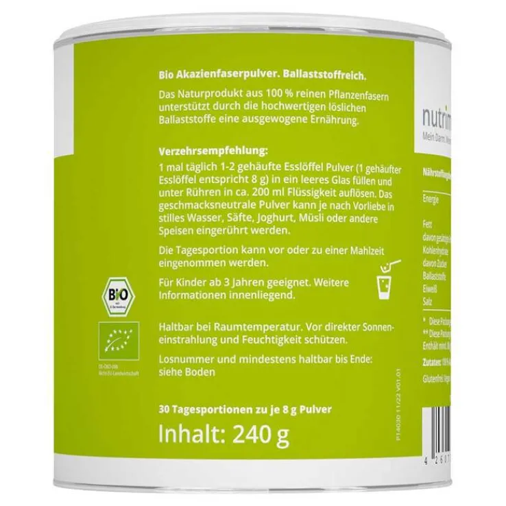 Mybiotic Biofibre Bio Akazienfaserpulver ist ein ballaststoffreiches Naturprodukt aus 100 % reinen Pflanzenfasern. Es enthält hochwertige lösliche Ballaststoffe, die eine ausgewogene Ernährung unterstützen. Ballaststoffe gehören zu einer gesunden Ernährung, da sie die Verdauung unterstützen, sättigend sind und der Darmflora als Nahrungsquelle dienen.