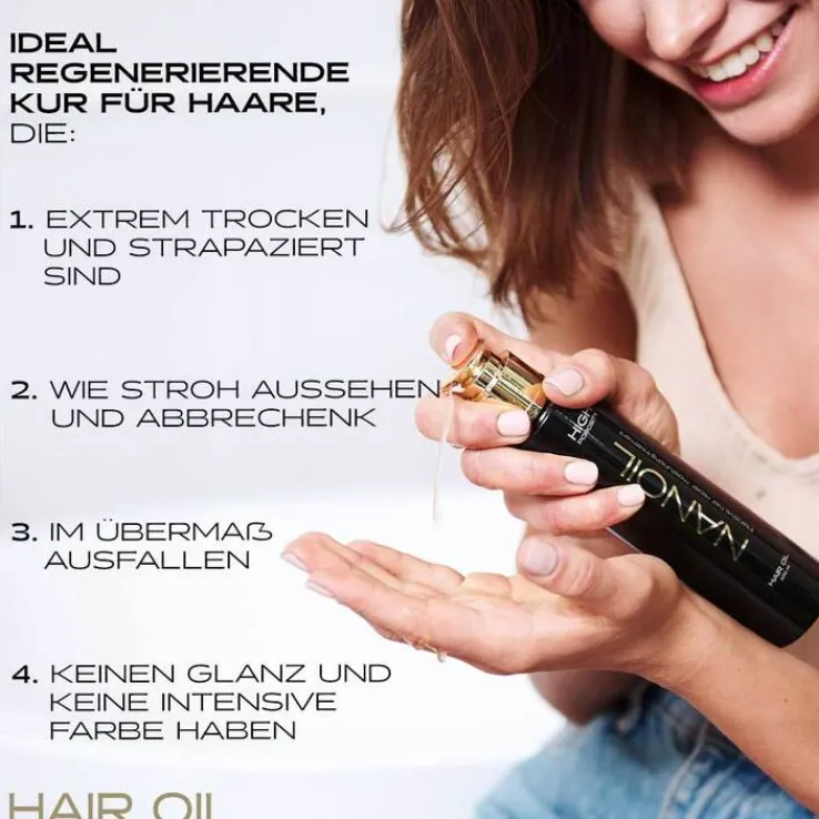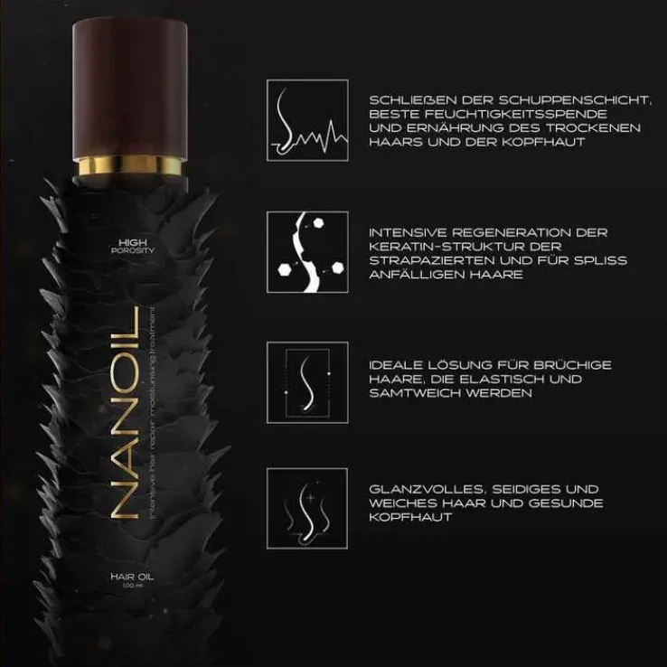Wenn Ihre Haare geschwächt sind, stark ausfallen und an Elastizität verlieren, wählen Sie Nanoil. Es ist an die Bedürfnisse der Haare angepasst und liefert den Haaren mit hoher Porosität alles, was sie brauchen.