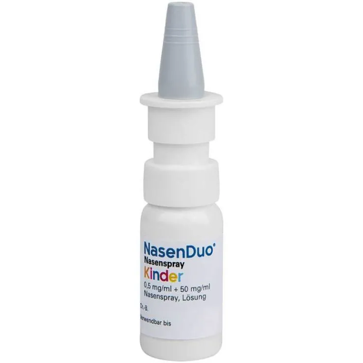 NasenDuo® Nasenspray Kinder. Anwendungsgebiete: Zur Abschwellung der Nasenschleimhaut bei Schnupfen und zur unterstützenden Behandl. der Heilung von Haut- und Schleimhautschäden, anfallsweise auftretendem Fließschnupfen und zur Behandl. der Nasenatmungsbehinderung nach operativen Eingriffen an der Nase. -Nasenspray 1 mg/ml + 50 mg/ml Nasenspray ist für Erwachsene und Kinder ab 6 Jahren -Nasenspray Kinder 0,5 mg/ml + 50 mg/ml Nasenspray ist für Kinder zwischen 2 und 6 Jahren. Apothekenpflichtig. Zu Risiken und Nebenwirkungen lesen Sie die Packungsbeilage und fragen Sie Ihre Ärztin, Ihren Arzt oder in Ihrer Apotheke. 3/23.