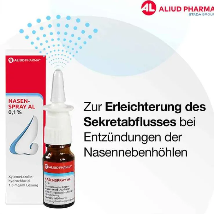 NASENSPRAY AL 0,1% Xylometazolinhydrochlorid 1,0 mg/ml Lösung Zur Anwendung bei Kindern ab 6 Jahren und Erwachsenen. Wirkstoff: Xylometazolinhydrochlorid. Zur Abschwellung der Nasenschleimhaut bei Schnupfen, anfallsweise auftretendem Fließschnupfen (Rhinitis vasomotorica), allergischem Schnupfen (Rhinitis allergica). Zur Erleichterung des Sekretabflusses bei Entzündung der Nasennebenhöhlen sowie bei Katarrh des Tubenmittelohres in Verbindung mit Schnupfen. Hinweis: Enthält Benzalkoniumchlorid. Sollte nicht länger als 7 Tage angewendet werden, es sei denn auf ärztliche Anordnung. Zu Risiken und Nebenwirkungen lesen Sie die Packungsbeilage und fragen Sie Ihre Ärztin, Ihren Arzt oder in Ihrer Apotheke. ALIUD PHARMA GmbH, Postfach 1380, 89146 Laichingen Stand: März 2021