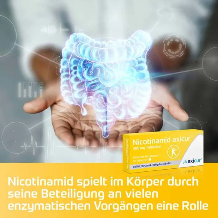 Nicotinamid axicur® 200 mg Tabletten. Anwendungsgebiete: Vitamin-Präparat zur Anwendung bei Behandlung klinischer Nicotinamid-Mangelzustände bei Mangel- und Fehlernährung sowie bei gesteigertem Bedarf. Zu Risiken und Nebenwirkungen lesen Sie die Packungsbeilage und fragen Sie Ihre Ärztin, Ihren Arzt oder in Ihrer Apotheke. axicorp Pharma GmbH, 61381 Friedrichsdorf. Stand: April 2022