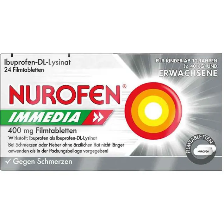 NUROFEN® Immedia 400 mg Filmtabletten enthalten den Wirkstoff Ibuprofen als Ibuprofen-DL-Lysinat. Durch Kombination mit der Aminosäure Lysin ist Ibuprofen besonders gut löslich, wird sehr schnell vom Körper aufgenommen und gelangt so schneller an den Ort der Schmerzentstehung. Das macht es zum idealen Schmerzmittel für Patient*innen, die eine besonders schnelle Schmerzlinderung suchen.