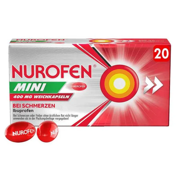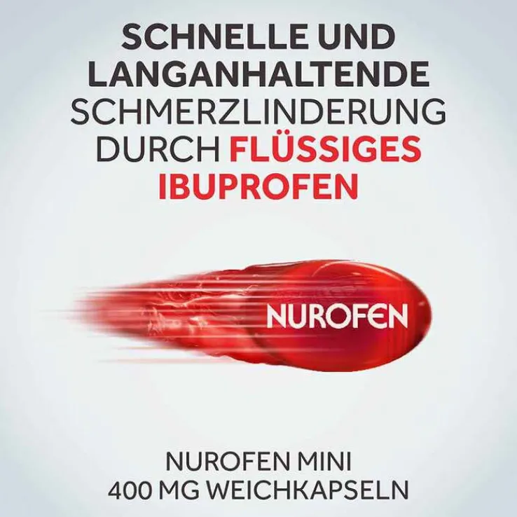 Durch das Ibuprofen in gelöster Form kann der Wirkstoff schnell vom Körper aufgenommen werden. Die weichen NUROFEN® MINI Kapseln sind 15 % kleiner als NUROFEN® 400 mg Weichkapseln, wodurch das Medikament leichter zu schlucken ist als gewöhnliche Schmerztabletten.