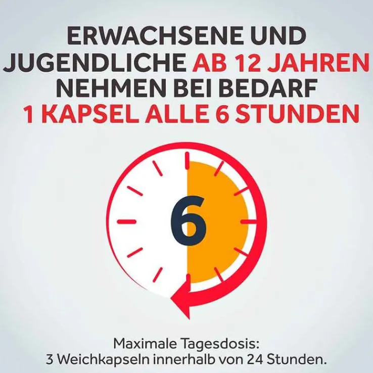 Erwachsene und Jugendliche ab 40 kg Körpergewicht (ab 12 Jahren) nehmen 1 Kapsel, bei Bedarf bis zu dreimal täglich, ein. Zwischen den einzelnen Dosen sollten mindestens 6 Stunden liegen. Es sollten nicht mehr als 3 Kapseln innerhalb von 24 Stunden eingenommen werden.