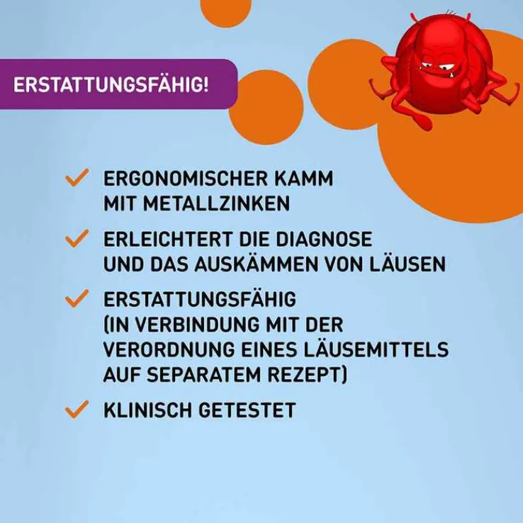 Ein Läuse- und Nissenkamm eignet sich zum Auskämmen und Identifizieren von Kopfläusen, deren Larven und Nissen. Die Untersuchung des Kopfhaares mit dem speziell entwickelten Kamm ist schneller und effektiver als eine rein visuelle Inspektion. Zudem erleichtert der Läusekamm nach der Behandlung mit NYDA® das Entfernen der abgetöteten Läuse und Nissen. Der NYDA® Läuse- und Nissenkamm weist einen geringen Abstand zwischen den Zinken und abgerundete Enden auf – damit die Behandlung gründlich und auch schonend für die Kopfhaut ist.