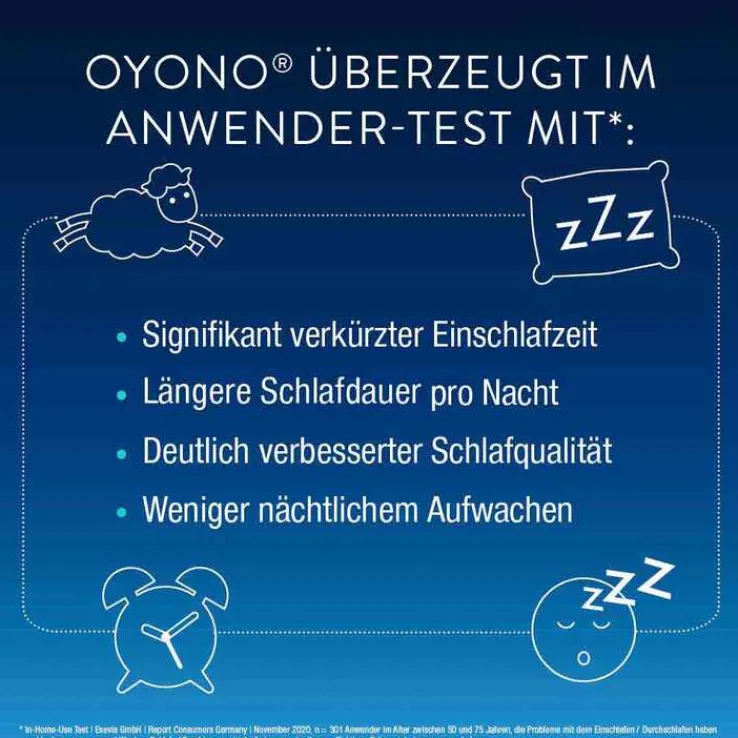 Ergebnisse eines mit 300 Verwendern von Schlafmitteln durchgeführten Tests³ zeigen: Die durchschnittliche Einschlafzeit verkürzte sich bei Probanden unter der Einnahme von Oyono innerhalb von nur zwei Wochen von 40 auf 20 Minuten. Zusätzlich führte die Einnahme zu einer deutlich verbesserten Schlafqualität. Die Einnahme führte weiterhin zu weniger nächtlichem Aufwachen bei den Probanden.