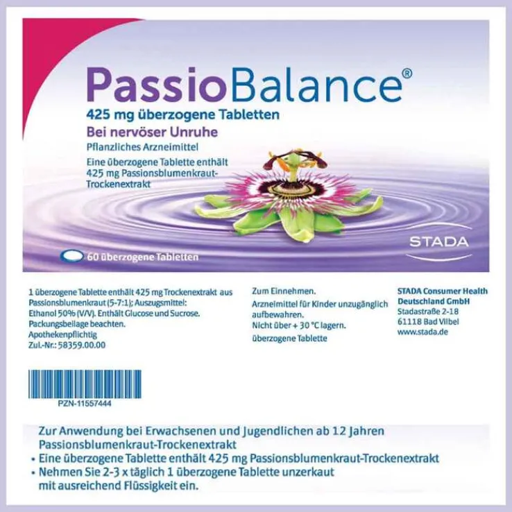 PassioBalance® 425 mg überzogene Tabletten. Zur Anwendung bei Erwachsenen und Jugendlichen ab 12 Jahren. Wirkstoff: Passionsblumenkraut-Trockenextrakt. Wird angewendet bei nervösen Unruhezuständen. Enthält Glucose und Sucrose. Zu Risiken und Nebenwirkungen lesen Sie die Packungsbeilage und fragen Sie Ihre Ärztin, Ihren Arzt oder in Ihrer Apotheke. STADA Consumer Health Deutschland GmbH, Stadastraße 2–18, 61118 Bad Vilbel. Stand: März 2021