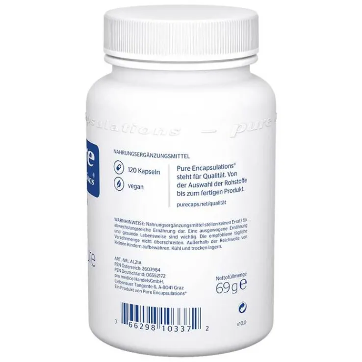 Pure Encapsulations Alpha Liponsäure 200 mg enthält die auch als Thioctsäure bekannte Alpha Liponsäure, welche vom Körper in geringem Maße selbst produziert wird. Wie alle Produkte von Pure Encapsulations wird auch Alpha Liponsäure nach strengen internationalen Standards produziert. Um die hohe Produktqualität langfristig und nachhaltig sicherzustellen, wird der gesamte Prozess von der Herstellung bis hin zur Lagerung laufend geprüft. Dabei werden interne und externe Qualitätskontrollen in jedem einzelnen Schritt durchgeführt.