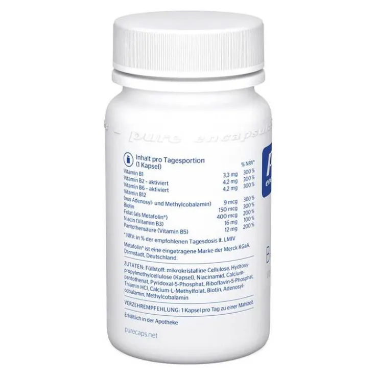 Bei der Zufuhr von B-Vitaminen ist es wichtig, dass diese rasch für die verschiedensten Prozesse verfügbar sind. B-Complex von Pure Encapsulations erfüllt dieses Kriterium ideal, da auf bereits biologisch aktive Verbindungen zurückgegriffen wird. So trägt beispielsweise Vitamin B6 zu einem normalen Homocystein-Stoffwechsel bei.* Die Vitamine B12 und Folsäure (Folat) beteiligen sich in ihrer Coenzym-Form an der Zellteilung und wirken unter anderem am Aufbau der Myelinscheiden, dem Schutzmantel der Nervenbahnen, mit.*