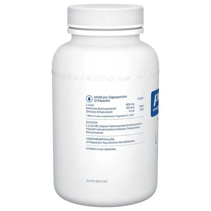 Zutaten: L-Lysin HCl, Kapsel: Hydroxypropylmethylcellulose, Füllstoff: mikrokristalline Cellulose, Zinkpicolinat, Natriumselenit