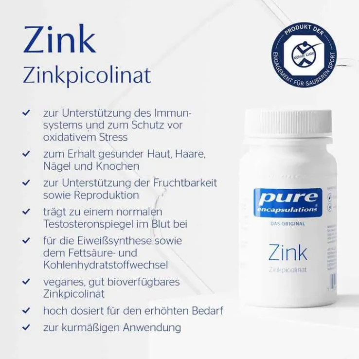Zink 30 von Pure Encapsulations ist an Picolinsäure gebundenes Zink in Kapselform. Diese Zinkverbindung gilt als sehr gut verträglich und kann vom Körper leicht aufgenommen und verwertet werden, da Picolinsäure von Natur aus im Körper vorkommt. Die Kapseln eignen sich ideal zur Nahrungsergänzung bei einem höheren Tagesbedarf an Zink, etwa bei Rauchern, vegetarischer Ernährung oder als zusätzliche Unterstützung des Immunsystems.*