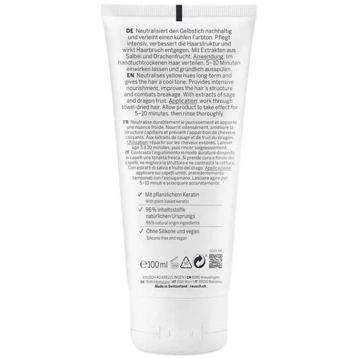 Die Silberglanz-Kur mit Salbei hat Rausch F&E-Leiterin Fabienne kurzerhand selbst entwickelt, da sie kein Produkt fand, welches das kühle Blond ihrer Mähne erhält und gleichzeitig intensiv pflegt. Entstanden ist diese wohltuende Spezialpflege, die Haarbruch entgegenwirkt und dank innovativem pflanzlichem Keratin die Haarstruktur verbessert. Und das spürbar: Das Haar fühlt sich schon nach einer Anwendung wunderbar geschmeidig und gepflegt an. Violette Pigmente neutralisieren den Gelbstich und sorgen für einen natürlich kühlen Blondton.