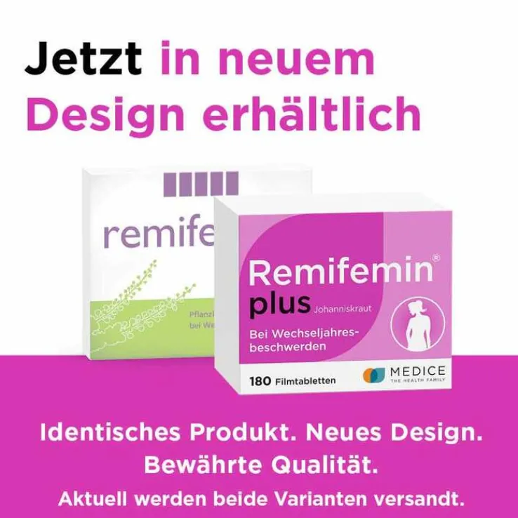remifemin® PLUS Johanniskraut. Anwendungsgebiete: zur Linderung von Hitzewallungen und übermäßigem Schwitzen in den Wechseljahren, wenn diese Symptome mit zusätzlichen psychischen Wechseljahresbeschwerden wie z.B. Verstimmungszuständen, Nervosität und Reizbarkeit einhergehen. Warnhinweis: 1 Filmtablette enthält 163 mg Lactose und 0,5 mg (3-sn-Phosphatidyl)cholin (Sojabohne). Packungsbeilage beachten! Zu Risiken und Nebenwirkungen lesen Sie die Packungsbeilage und fragen Sie Ihre Ärztin, Ihren Arzt oder in Ihrer Apotheke. Apothekenpflichtig. Stand: 11/2023. Schaper & Brümmer GmbH & Co. KG, Bahnhofstr. 35, 38259 Salzgitter