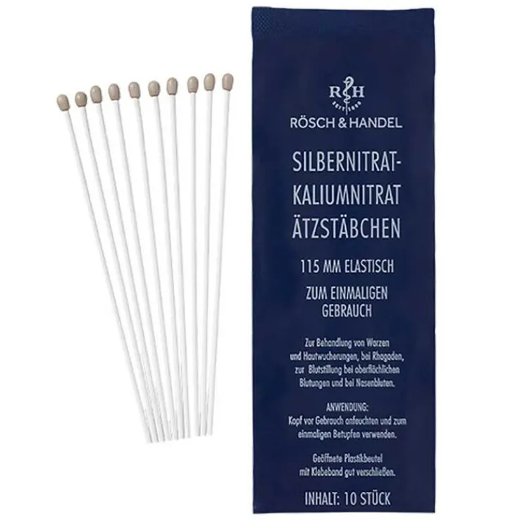 Silbernitrat Ätzstäbchen dienen der chemischen Kauterisierung mittels einer auf dem Köpfchen angebrachten Mischung aus Silbernitrat und Kaliumnitrat. Sie werden seit langem in Arzneibüchern beschrieben und kommen äußerlich in den verschiedensten Anwendungsgebieten zum Einsatz.