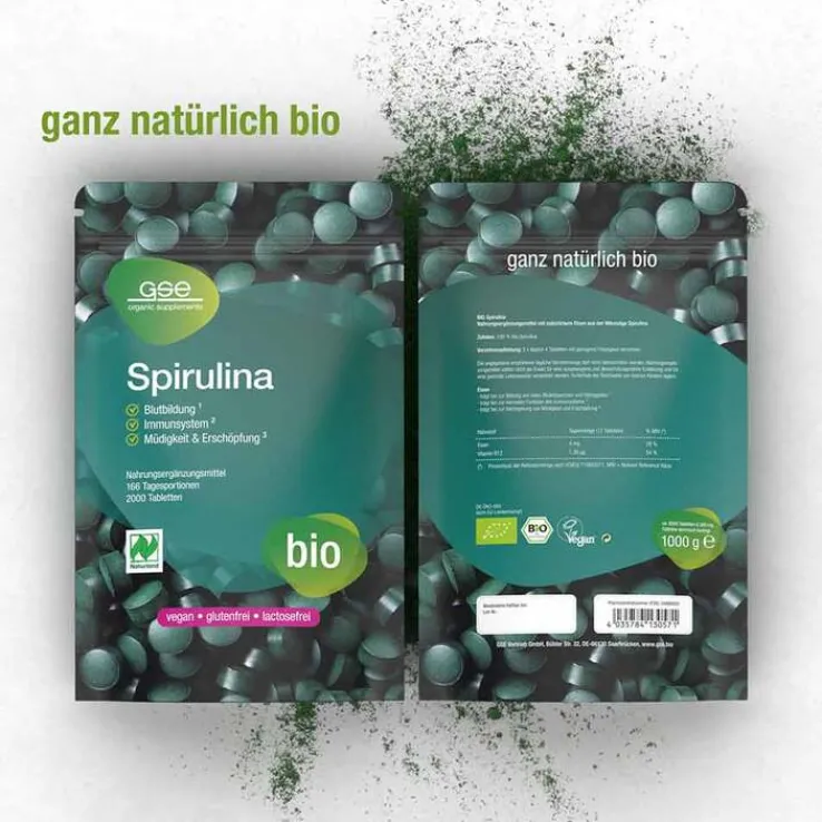 100 % Spirulina, ökologisch zertifiziert nach den privaten Richtlinien von Naturland, Deutschland