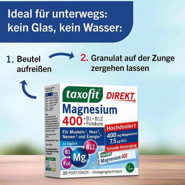 Taxofit Magnesium 400 Direkt-Granulat mit leckerem Orangengeschmack versorgt den Körper mit Magnesium. Die Einnahme ohne Wasser macht es dabei zum idealen Begleiter. Im Alltag genauso wie unterwegs. Der Körper wird schnell und zuverlässig mit Magnesium sowie den Vitaminen B1, B6, B12 und Folsäure versorgt.