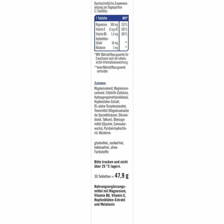 Magnesiumoxid, Magnesiumcarbonat, Füllstoffe (Cellulose, Hydroxypropylmethylcellulose), Hopfenblüten Extrakt, DL-alpha-Tocopherylacetat, Trennmittel (Magnesiumsalze der Speisefettsäuren, Siliciumdioxid, Talkum), Überzugsmittel (Glycerin, Carnaubawachs), Pyridoxinhydrochlorid, Melatonin.