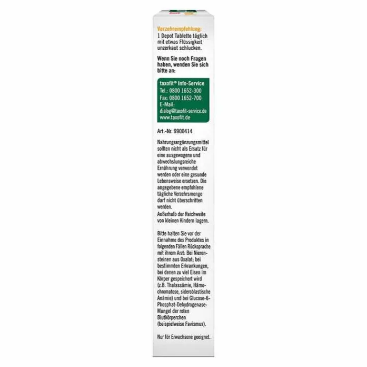 Bitte halten Sie vor der Einnahme des Produktes in folgenden Fälen Rücksprache mit ihrem Arzt: Bei Nierensteinen aus Oxalat; bei bestimmten Erkrankungen, bei denen zu viel Eisen im Körper gespeichert wird (z.B. Thalassämie, Hämochromatose, sideroblastische Anämie) und bei Glucose-6-Phospat-Dehydrogenase-Mangel der roten Blutkörperchen (beispielsweise Favismus).