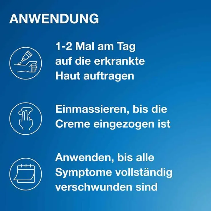 eine ausreichende Menge Creme auf die erkrankte Haut und die umgebende Hautfläche (ca. 1 – 2 cm) auf. Massieren Sie die Creme mit den Fingern solange ein, bis sie eingezogen ist.