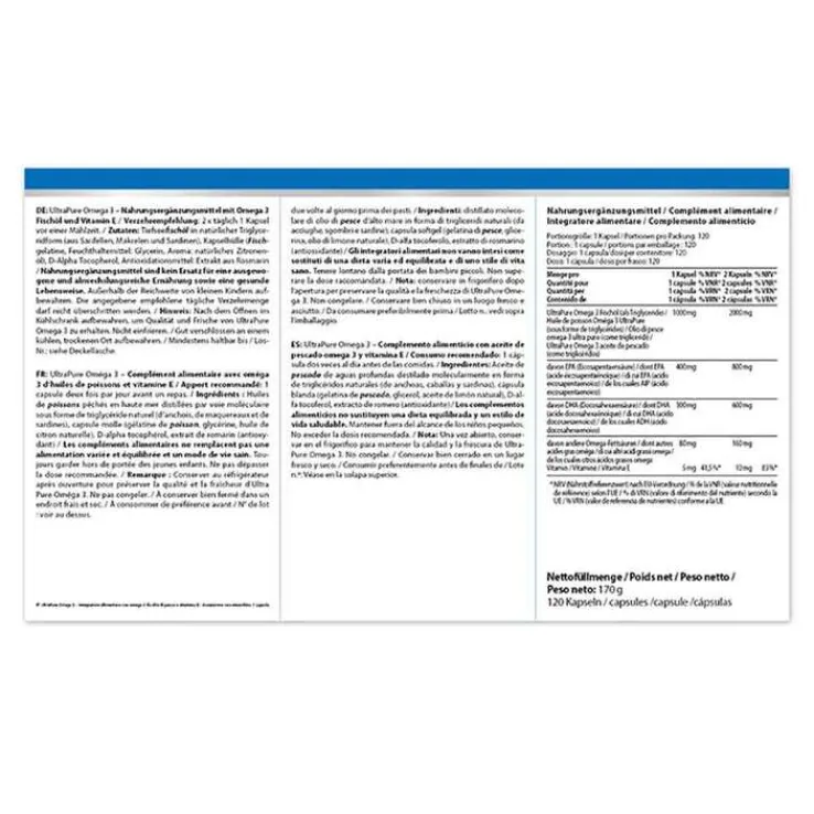 Nach dem Öffnen im Kühlschrank aufbewahren, um Qualität und Frische von UltraPure Omega 3 zu erhalten. Nicht einfrieren.