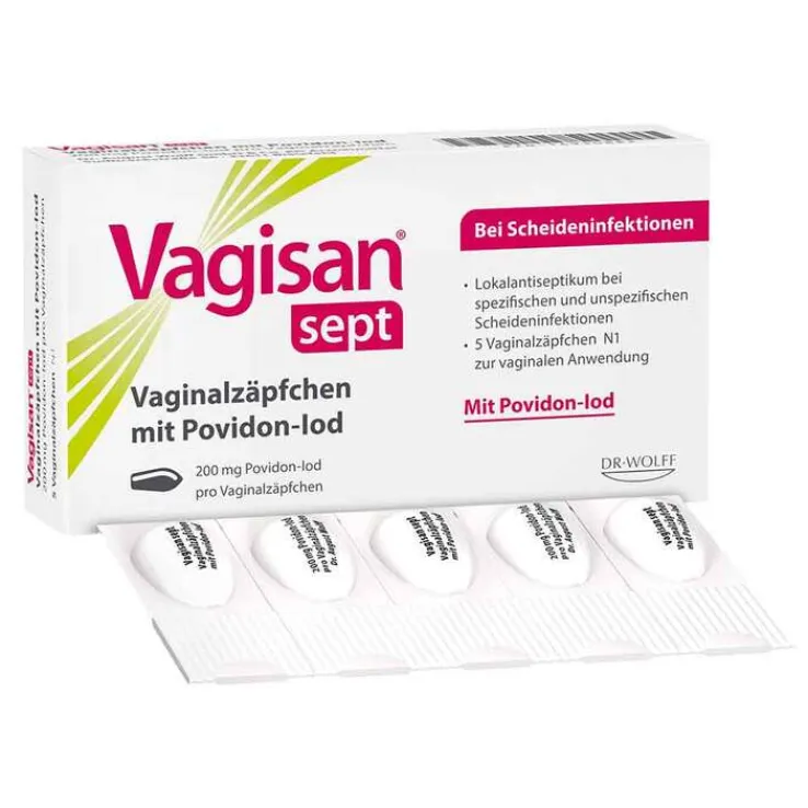 Vagisan sept Vaginalzäpfchen mit Povidon-Iod. Wirkstoff: Povidon-Iod. Anwendung: Iod-empfindliche spezifische und unspezifische Vaginalinfektionen und Scheideninfektionen durch Trichomonas vaginalis und Candida albicans. Zu Risiken und Nebenwirkungen lesen Sie die Packungsbeilage und fragen Sie Ihre Ärztin, Ihren Arzt oder in Ihrer Apotheke.