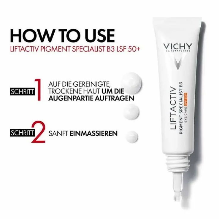 Als ersten Schritt der täglichen Hautpflegeroutine das Gesicht gründlich reinigen und anschließend vorsichtig abtrocknen. Nun eine kleine Menge der Vichy Liftactiv Pigment Specialist B3 Augenpflege LSF50+ entlang der Augenpartie auftragen und sanft, ohne zu zupfen, einmassieren.