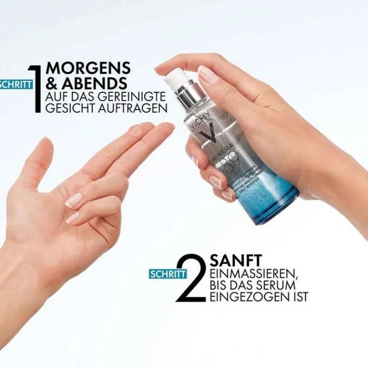 Den Vichy Mineral 89 Hyaluron-Boost täglich morgens und abends als ersten Schritt der Pflegeroutine auf das gereinigte Gesicht, auf Hals und Dekollete auftragen. Dafür zwei Pumpstöße mit den Fingerspitzen sanft einmassieren. Da die sanfte Formel der Gesichtspflege auf Alkohol & Duftstoffe verzichtet, ist sie auch für die Anwendung auf empfindlicher Haut geeignet.
