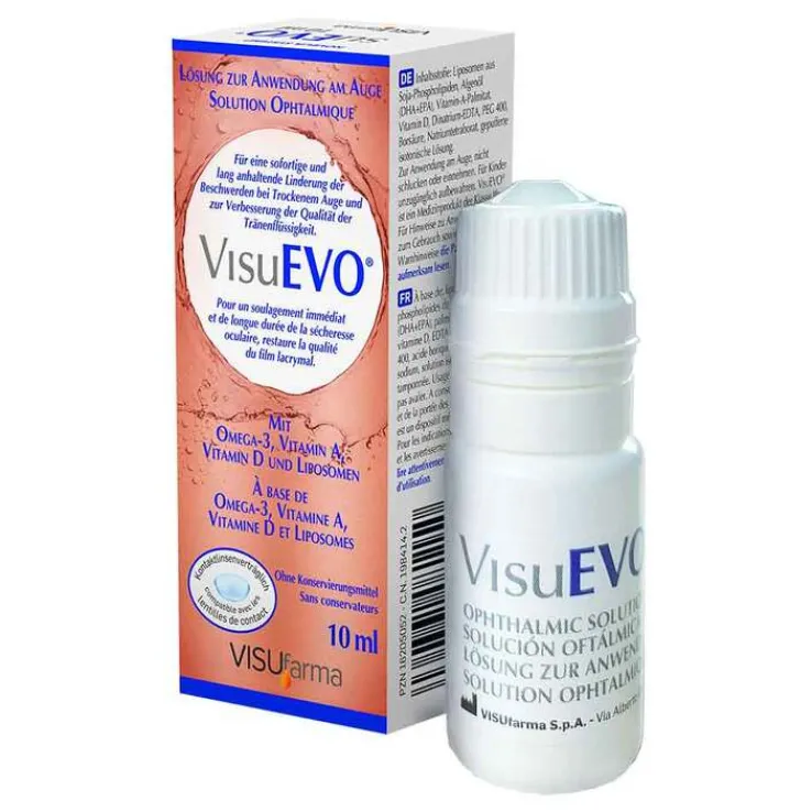 Durch die Kombination seiner Inhaltsstoffe ist VisuEVO® einzigartig. Bei VisuEVO® handelt es sich um Augentropfen mit der einzigartigen Kombination aus Vitamin A, Vitamin D, Omega-3-Fettsäuren und ultragefilterten Phospholipiden für das evaporative Trockene Auge.