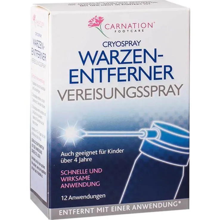 Das CARNATION®-Kältespray zur Warzenentfernung ist eine Sprühdose, die eine nicht umweltschädigende Mischung aus Dimethylether, Butan, Isobutan und Propan enthält. Durch schnelles Gefrieren des Kerns der Warze bildet sich eine kleine Blase. Die Warze sollte über die nächsten 10-14 Tage allmählich verschwinden oder abfallen.