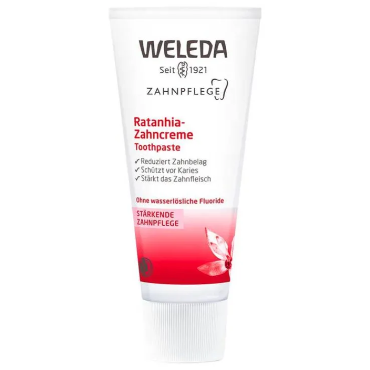 Die erfrischende Weleda Ratanhia-Zahncreme mit einem mineralischen Putzkörper aus Calciumcarbonat (Kreide) reinigt die Zähne sanft und gründlich. Regelmäßiges Putzen mit der Ratanhia-Zahncreme entfernt Zahnbelag gründlich und schützt so zuverlässig vor Karies.