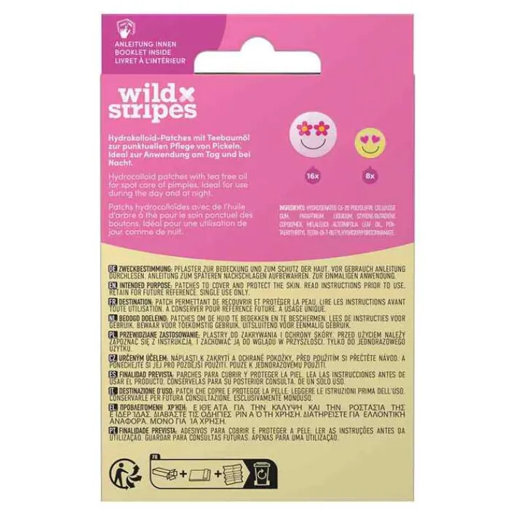 Die Wild Stripes Anti-Pickel Patches enthalten Hydrokolloid und Hyaluronsäure für gezielte Pflege und Feuchtigkeitsversorgung. Die Patches decken Pickel und Hautunreinheiten unauffällig ab , sind somit ideal für den Tag und die Nacht. Die Pflaster sind hautfreundlich und sanft zur Haut.