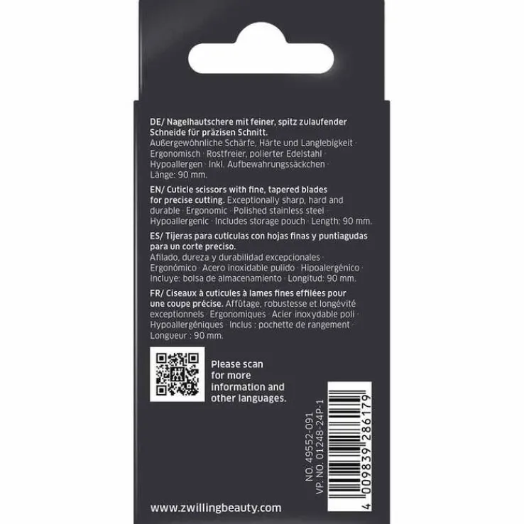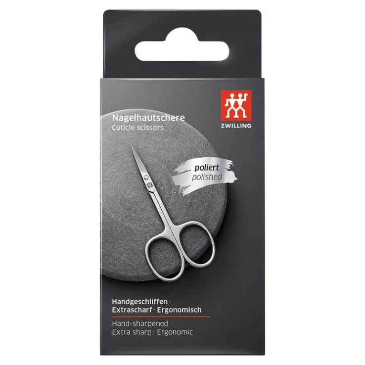 Zwilling Hautscheren sind kleine, sehr feine Scheren mit gebogener, dünner und sehr spitzer Schneide. Sie sind ideal zum Entfernen gelöster Nagelhaut und störender Hautreste am Nagelbett. Hautscheren mit extra angeschliffener Spitze – die sogenannte Turmspitze – haben ein besonders feines, dünnes Blatt. Um die filigrane Spitze der Schere nicht zu schädigen, sollten Hautscheren nur für den vorgesehenen Zweck eingesetzt werden!