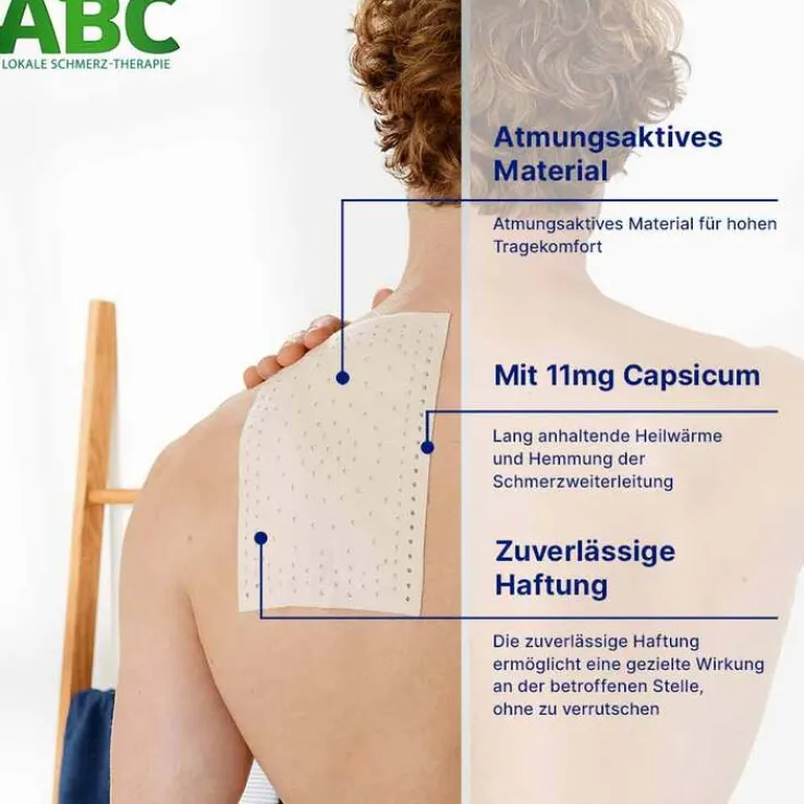 ABC Lokale Schmerz-Therapie Wärme-Pflaster Capsicum 11 mg. Anwendungsgebiete: lokale Behandlung zur Linderung von Muskelschmerzen, z. B. Schmerzen im unteren Rückenbereich. Enthält Wollwachs. Wirkstoff: Cayennepfeffer-Dickextrakt. Zu Risiken und Nebenwirkungen lesen Sie die Packungsbeilage und fragen Sie Ihre Ärztin, Ihren Arzt oder in Ihrer Apotheke.