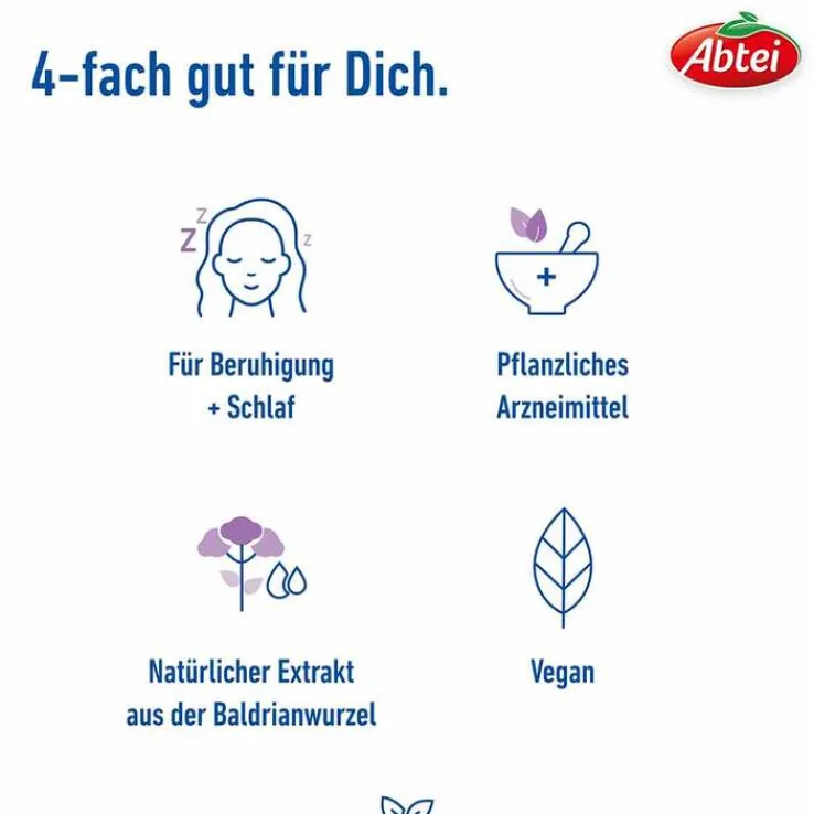 Abtei Baldrian Beruhigungs-Tropfen Wirkstoff: Baldriantinktur Anwendungsgebiete: Unruhezustände, nervös bedingte Einschlafstörungen Warnhinweise: Dieses Arzneimittel enthält 66 Vol.-% Alkohol. Packungsbeilage beachten. Zu Risiken und Nebenwirkungen lesen Sie die Packungsbeilage und fragen Sie Ihre Ärztin, Ihren Arzt oder in Ihrer Apotheke. Stand: Juni 2023