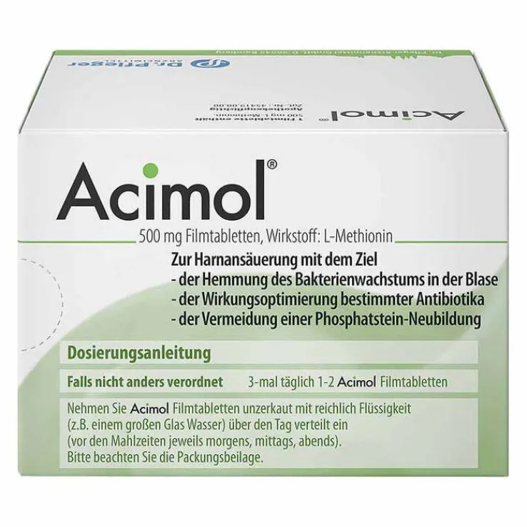 Acimol® 500 mg Filmtabletten. Anw.: Zur Harnansäuerung mit dem therapeutischen Ziel: Optimierung der Wirkung von Antibiotika mit Wirkungsoptimum im sauren Urin, Vermeidung der Steinneubildung bei Phosphatsteinen, Hemmung des Bakteriumwachstums. Zu Risiken und Nebenwirkungen lesen Sie die Packungsbeilage und fragen Sie Ihre Ärztin, Ihren Arzt oder in Ihrer Apotheke. (ACI/060513/LW).
