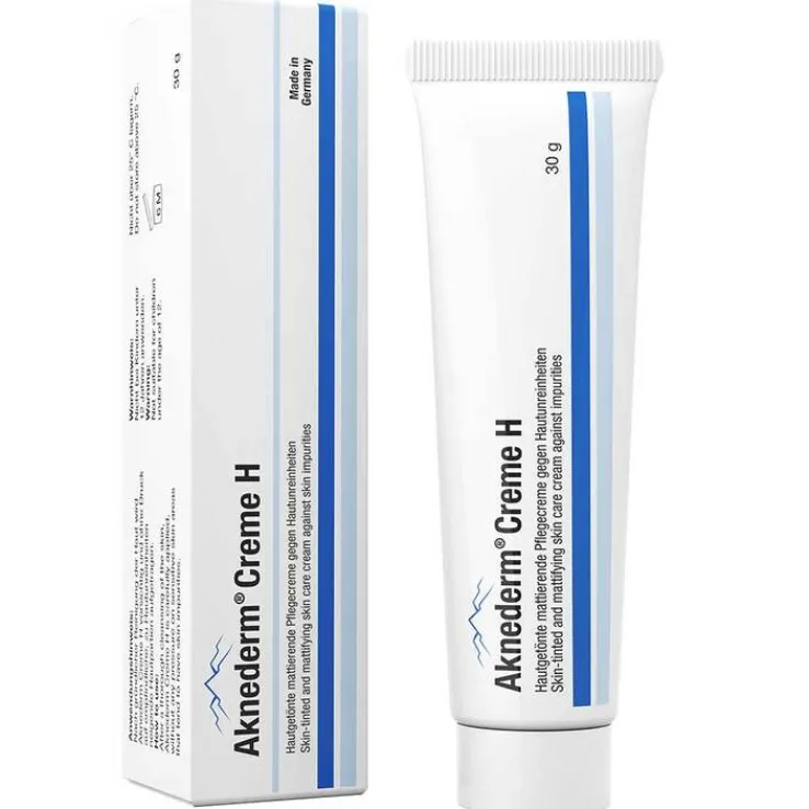 Aknederm Creme H mit natürlichem hellen Ölschiefer-Öl der Alpenregion, Zinkoxid und hochwertigem mikroporösen Kaolin ist eine hautgetönte, parfümfreie, mattierende Basispflege. Die Creme eignet sich bei Hautunreinheiten (z. B. Pickel, Mitesser, unreiner fettiger Haut, Hautrötungen und entzündeten Hautstellen).